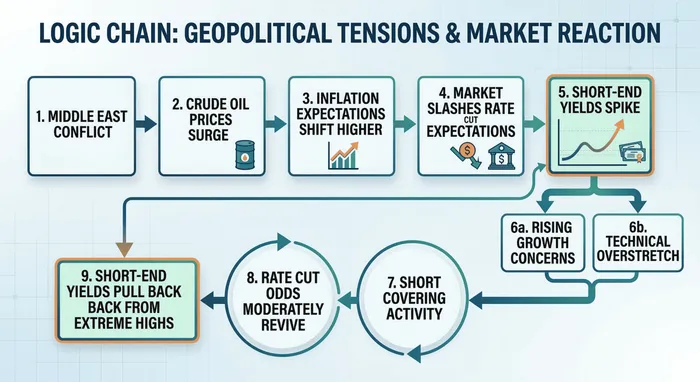 Según el análisis de Ainvest:Como se puede observar claramente en la cadena de lógica visual que describe las tensiones geopolíticas y las reacciones del mercado, el recorte actual en los rendimientos de los bonos de corta duración se debe principalmente a estos cambios técnicos. Por ejemplo, ciertas opciones de tipo “put” relacionadas con la tasa de financiamiento a plazo fijo generaron aproximadamente 10 millones de dólares en ganancias, gracias a las posiciones que se abrieron este año para apostar por un aumento en los rendimientos de los bonos de corta duración. La liquidación y la captación de ganancias relacionadas con estas posiciones derivadas han contribuido directamente al descenso reciente en los rendimientos de los bonos del Tesoro. Al disminuir estas posiciones de tipo “hawkish”, el mercado ha pasado naturalmente de un estado de pánico a un nivel más equilibrado, lo que ha reducido la presión sobre los costos de endeudamiento.