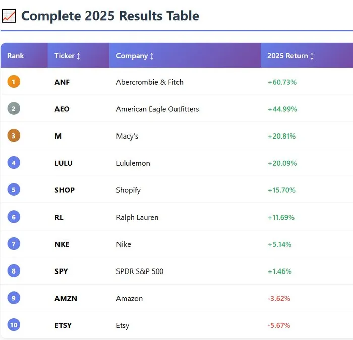Lululemon (LULU) +20.09%, Ralph Lauren (RL) +11.69%, and Shopify (SHOP) +15.70% all delivered respectable double-digit returns that aligned closely with their historical patterns. These results reinforce a key insight from our original analysis: premium brands with pricing power and loyal customer bases tend to produce consistent, if unspectacular, holiday momentum.