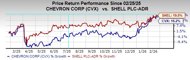 Over the past year, Shell shares have climbed nearly 20%, modestly outperforming Chevron’s 18.2% gain. Both stocks have benefited from resilient cash returns and expectations of a potential oil market rebalance in late 2026. The performance gap is relatively narrow, reflecting broadly similar investor sentiment toward large-cap integrated energy names.