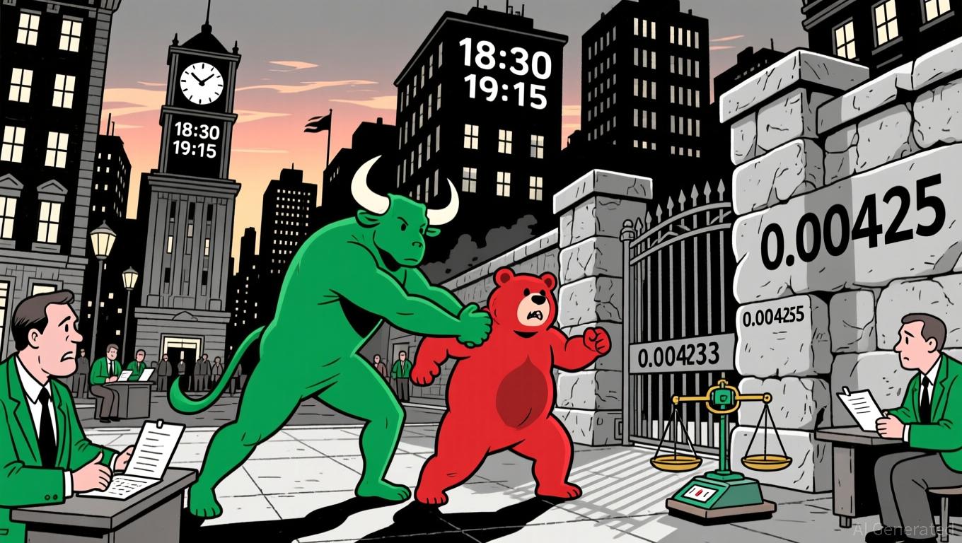 Price encountered a critical resistance cluster between 0.00425 and 0.00433, which it briefly overcame twice during the session. A strong bullish engulfing pattern emerged at 18:30 ET, confirming a short-term reversal after a pullback. However, a bearish engulfing candle followed at 19:15 ET, suggesting sellers regained control after the failed breakout. A doji at 0.004255 also indicated indecision around the 0.00425–0.00427 consolidation zone.