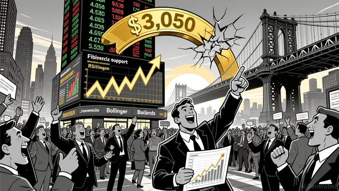 The 5-minute chart shows a bullish engulfing pattern forming above the $3,050 level, confirming a breakout from a consolidation zone. Key support levels were identified at $3,025 (61.8% Fib) and $2,990, while resistance moved to $3,060–$3,070 after the recent rally.
