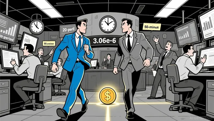 On the 5-minute chart, the 20-period and 50-period moving averages have converged near $3.06e-6, with the price oscillating just below the 50-period line. This suggests a potential retest or break of the key moving average could signal direction.