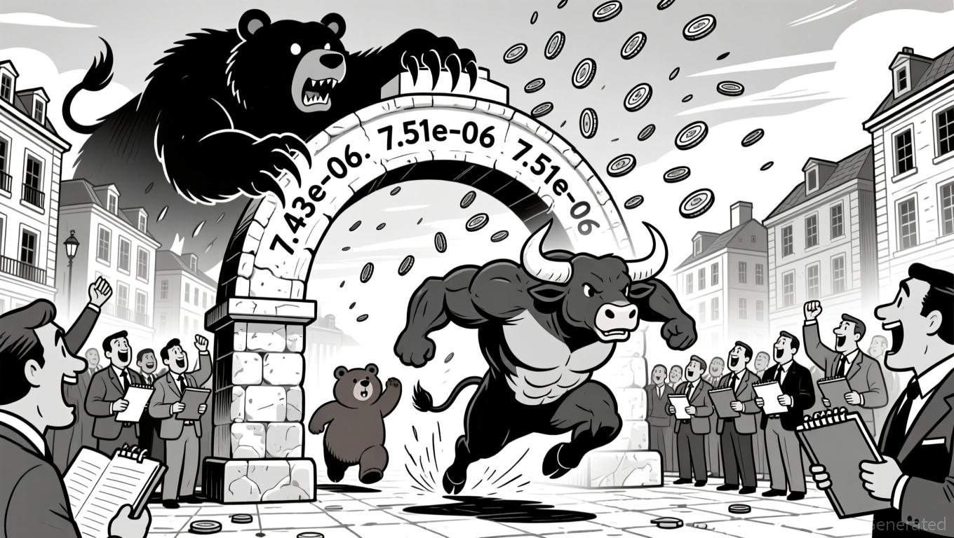Fibonacci retracements from the 7.43e-06 to 7.51e-06 swing show 7.46e-06 as a critical 38.2% support and 7.49e-06 as a key 61.8% resistance. The price currently appears to be consolidating near the 7.5e-06 level, which aligns with the 50-period MA on the daily chart and could become a pivotal level in the next 24 hours.