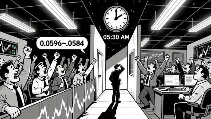 Key 5-minute retracements at 0.0592 (38.2%) and 0.0595 (61.8%) were tested twice, with the 0.0595 level holding as support during a final rally. On the daily chart, the 0.0599 close aligns with the 61.8% retrace of the prior 48-hour move, suggesting a potential near-term ceiling.