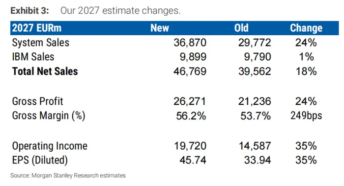 Morgan Stanley pronostica que los ingresos de ASML en el año fiscal 2027 serán de aproximadamente 51.500 millones de dólares. El beneficio antes de impuestos ascenderá a 21.700 millones de dólares, y la margen bruto aumentará al 56.2%.