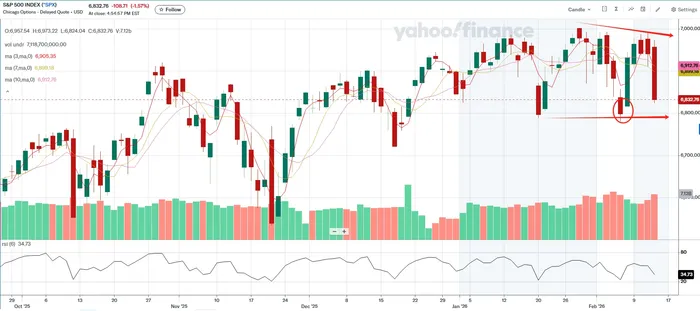 El índice S&P 500 también ha disminuido significativamente. Sin embargo, su estructura sigue siendo relativamente estable, ya que refleja la situación general de la economía en general, y no solo el sector tecnológico. El índice todavía se encuentra por encima de su nivel de soporte clave. No obstante, es necesario ser cautelosos, ya que las medias móviles a corto plazo también han bajado. Si el sector tecnológico continúa mostrando debilidad, será difícil para el índice S&P 500 mantenerse estable. Por eso, la idea de que la inteligencia artificial pueda desafiar las industrias tradicionales se ha vuelto tan importante. La situación técnica no está rota, pero es frágil. Los inversores deben respetar ese equilibrio.