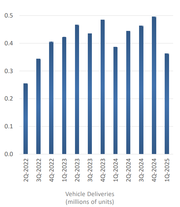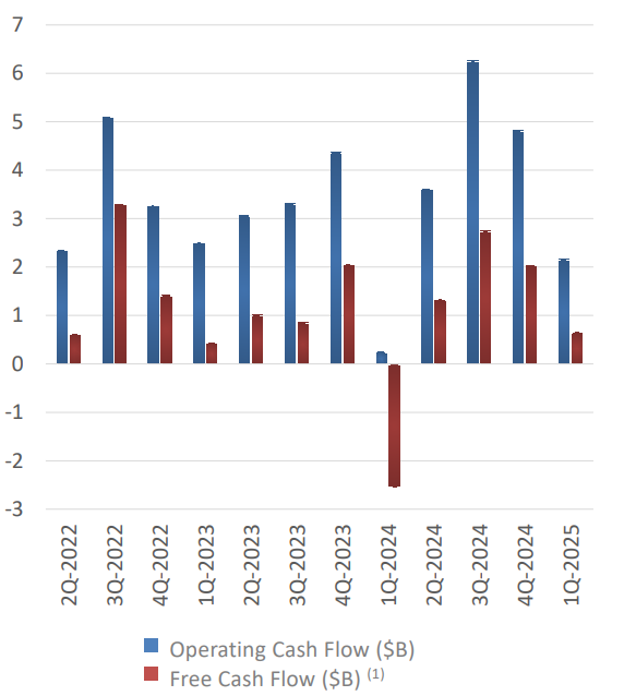 Tesla ended the quarter with $37 billion in cash and equivalents, a $0.4 billion increase from the prior period. Free cash flow came in at $664 million, down from estimates of $1.08 billion. Capital expenditures were $1.49 billion, down 46% year-over-year, as Tesla signaled that it is prudently managing spending in a volatile macro and trade environment.