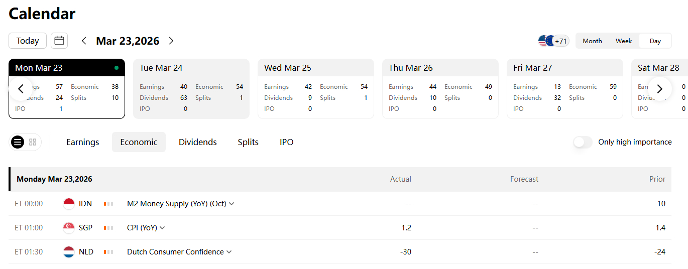 How to avoid the risk of losses through the financial calendar? Cryptocurrency and gold investors need to focus on the speeches of Federal Reserve officials and U.S. dollar index-related data in the Economic Events module, and avoid blindly increasing positions before the data is released; stock investors (especially U.S. stock investors) need to pay attention to the ex-dividend date in the Dividends module and the announcements in the Stock Splits & Mergers module to prevent losses caused by ignoring equity adjustments, and at the same time, use the Earings module to predict the risk of individual stocks' earnings reports falling short of expectations in advance.