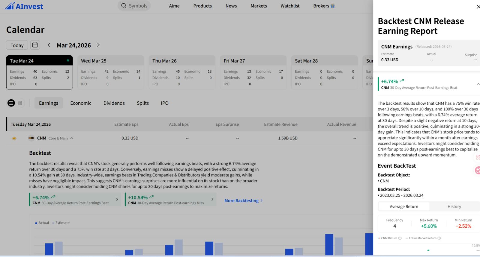 Click on the Earings module (U.S. market only) to view the release time and expected financial data (revenue, net profit) of U.S. listed companies' earnings reports. It supports filtering by "Industry" and "Market Capitalization". After the earnings report is released, it synchronizes the difference between actual data and expected data in real time to capture earnings report trends (Screenshot available: Earings Module Earnings Report Reminder Interface).