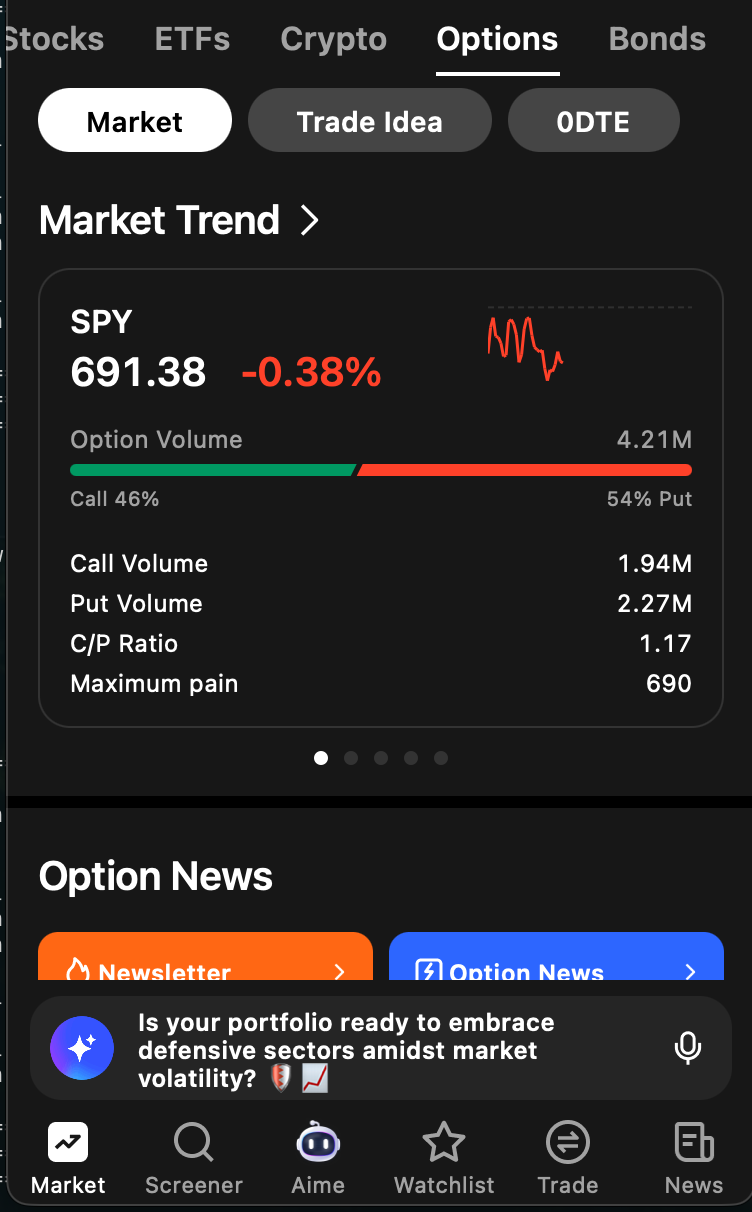 - Mobile: Open the Market tab, then tap Options. The Market Trend section displays a simplified summary with key metrics for major index ETFs. The mobile version prioritizes quick readability over the full interactive chart experience.