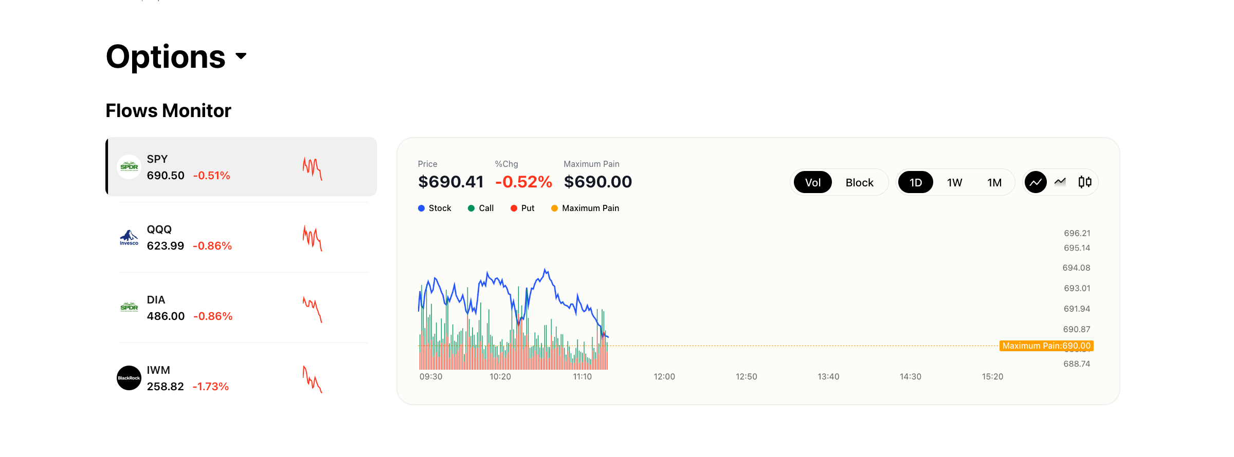 The Flows Monitor is an intraday chart that visualizes aggregate options volume — broken out by calls and puts — alongside the underlying asset's price movement. It provides a bird's-eye view of how options flow is shifting throughout the trading day, making it easy to spot divergences between volume and price, identify sentiment shifts, and track the maximum pain level.
