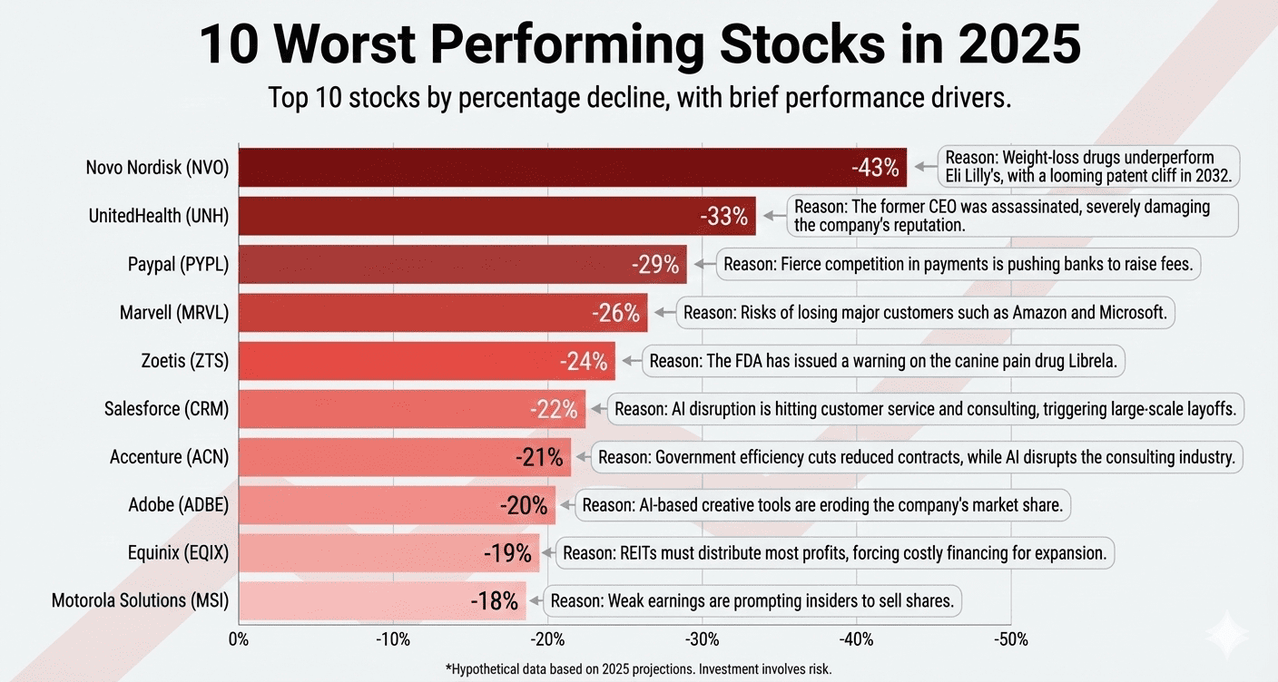 In contrast, the worst-performing stocks reveal two consistent weak spots.