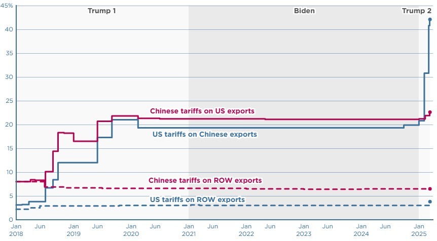 On Wednesday, Trump announced a 34% tariff on Chinese imports, set to take effect on April 9. This is in addition to the 10% tariffs imposed in both February and March, bringing the total to approximately 54%. For comparison, the average tariff during the Biden administration was around 20%, meaning the overall tariff rate on Chinese imports will now stand at ~74%.