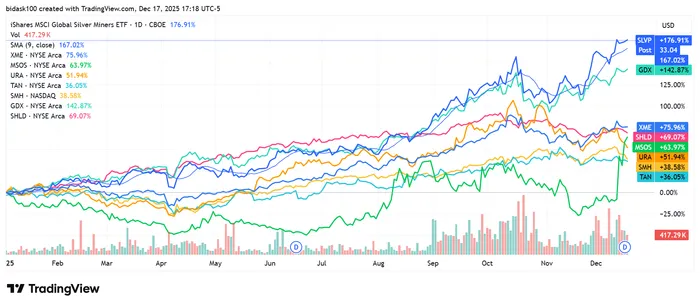 The undisputed champion of 2025 is the iShares MSCI Global Silver & Metals Miners ETF (SLVP), up a staggering 177% year-to-date. Close behind, the VanEck Gold Miners ETFGDX-- (GDX) has delivered a 143% return—its strongest annual performance in the fund's nearly two-decade history.