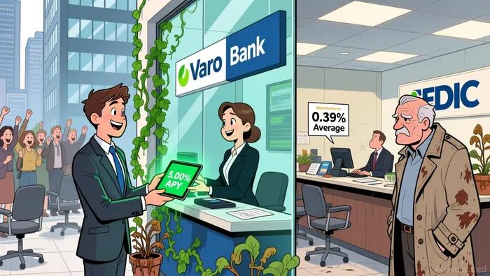 The top savings yield is a precise 5.00% APY, offered by Varo Bank and AdelFi. That rate is more than 12 times the FDIC's national average of 0.39% APY, highlighting a stark divide between elite offers and the market norm.