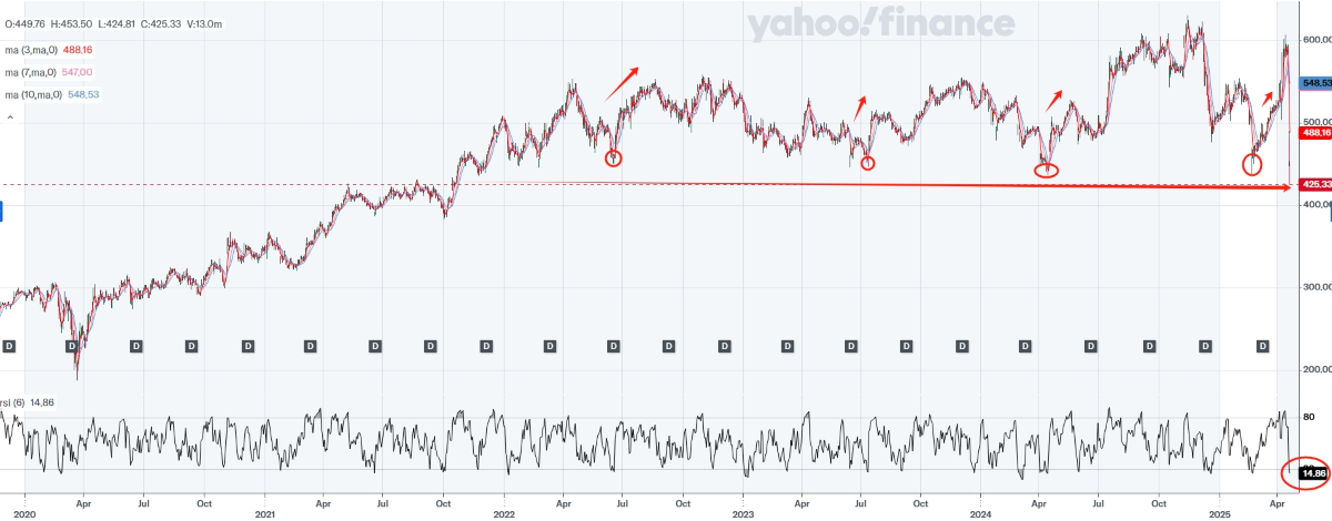 At its current price of $425, a three-and-a-half-year low, UnitedHealth is poised for a solid bounce. With an RSI of 14.858, the stock is strongly oversold, making it an attractive buy at these levels.