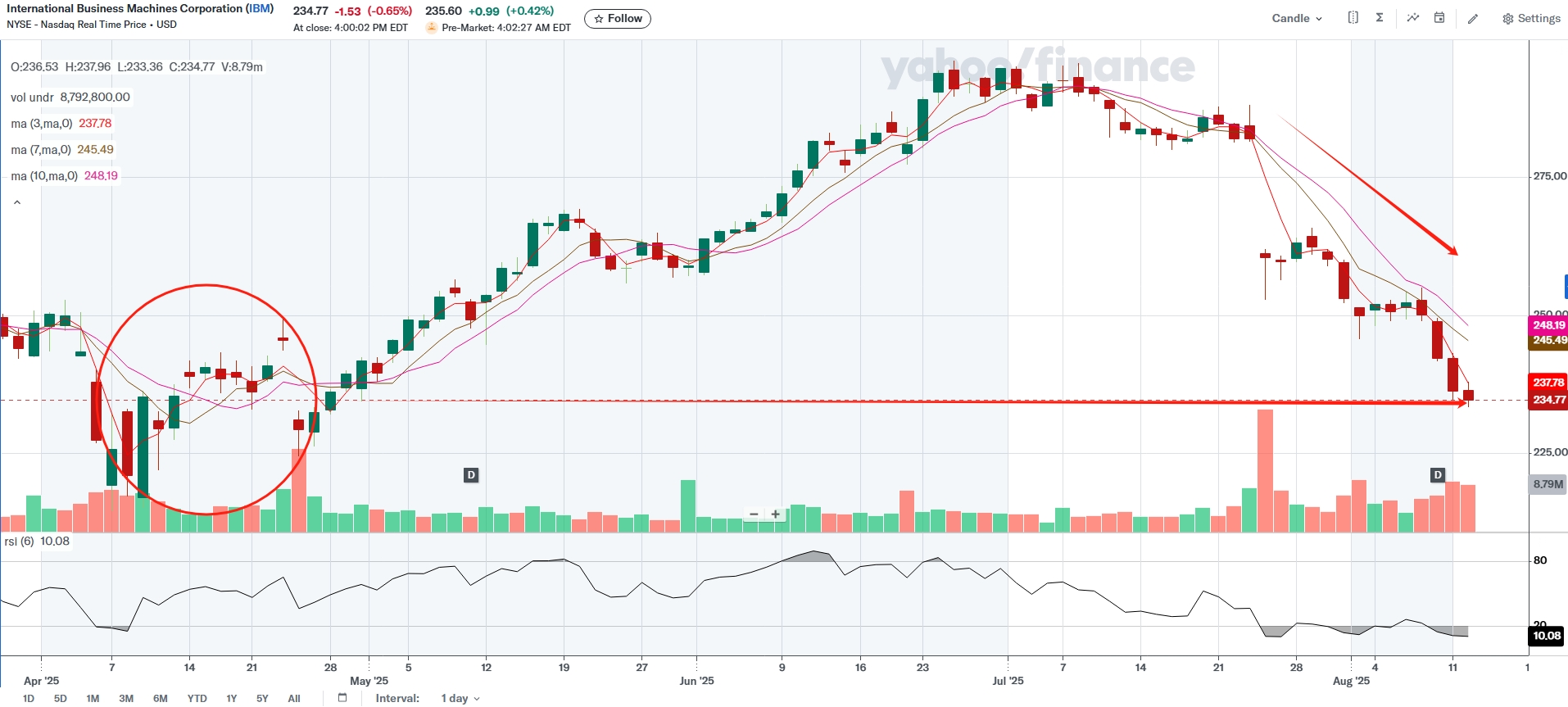IBM shares fell sharply after its Q2 earnings miss, as AI-driven growth failed to deliver a sustained boost. The RSI has dropped to 10.6, a level not seen since last October, signaling an extremely oversold condition. Back then, the stock rebounded 4% in a week as RSI normalized. A gradual buy-the-dip approach appears attractive now, with selling pressure possibly pushing RSI even lower for an improved entry point. For those who believe in IBM’s long-term potential in AI and quantum computing, holding through this weakness could be rewarding.