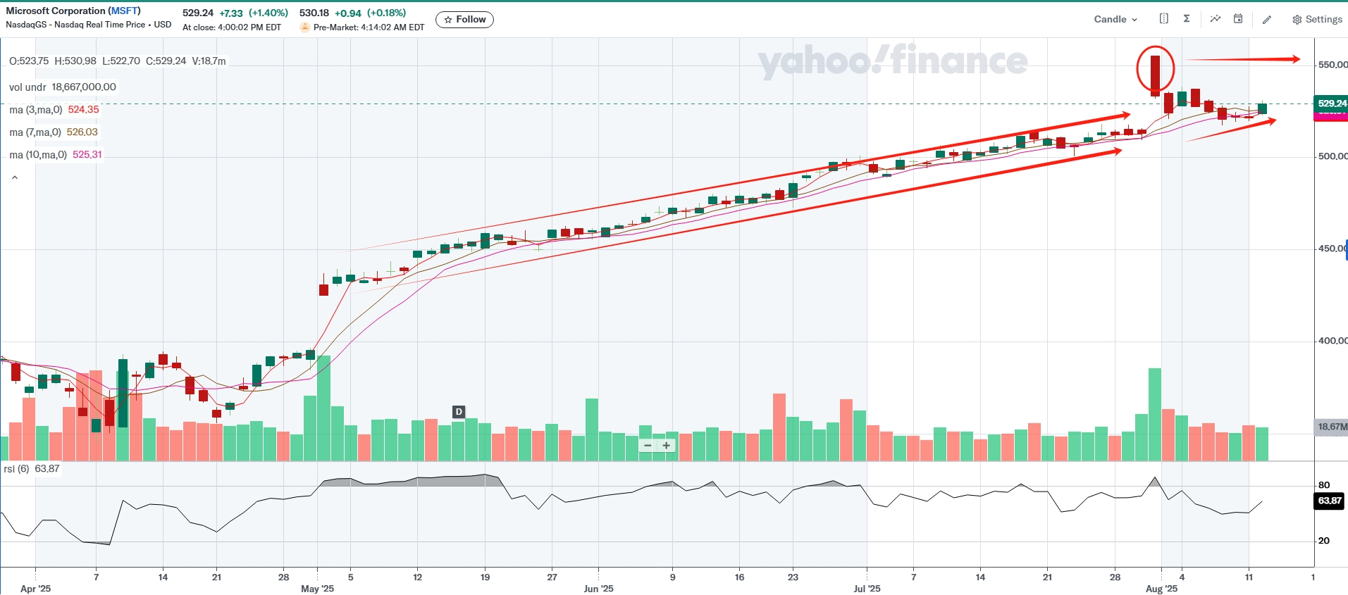 Microsoft’s shares have been consolidating after the initial post-earnings jump, and bullish momentum is building again. The upward slope of the MA (3, 7, 10) suggests a supportive chart structure, echoing the slow bull phase seen from May to July, which could be repeating now. With a market cap of $3.93 trillion, the first target is reclaiming $4 trillion, with potential to hold above that level on sustained strength. The company remains well-positioned to benefit from AI momentum and its deep integration with OpenAI.