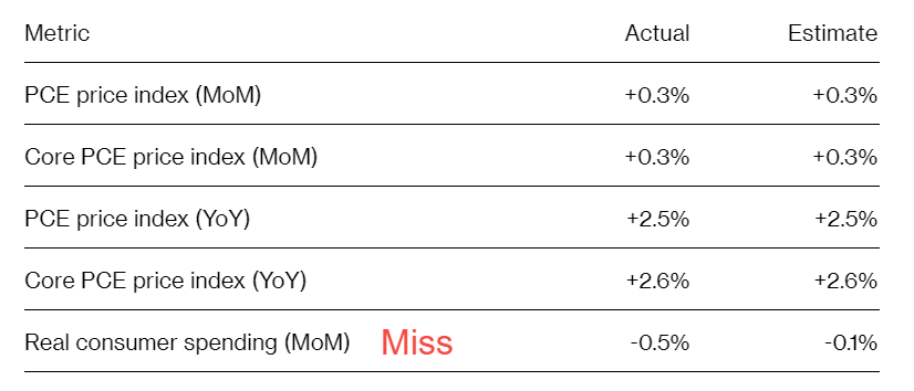 Elsewhere in the report, personal income saw a much stronger-than-expected increase of 0.9% for the month, far exceeding the forecasted 0.4% gain. However, higher income did not translate into more spending, as personal consumption fell 0.2%, contrary to expectations of a 0.1% increase.
