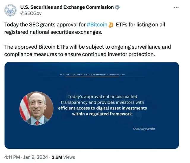 The incident began on the night of January 9th Eastern Time, when the U.S. Securities and Exchange Commission posted a notice on its official social media account on X (formerly Twitter), stating that a Bitcoin Exchange Traded Fund (ETF) had been approved for listing.