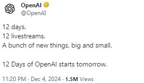 12 days, 12 livestreams, a bunch of new things, big and small. 12 Days of OpenAI starts tomorrow, the company said on social media platform X.