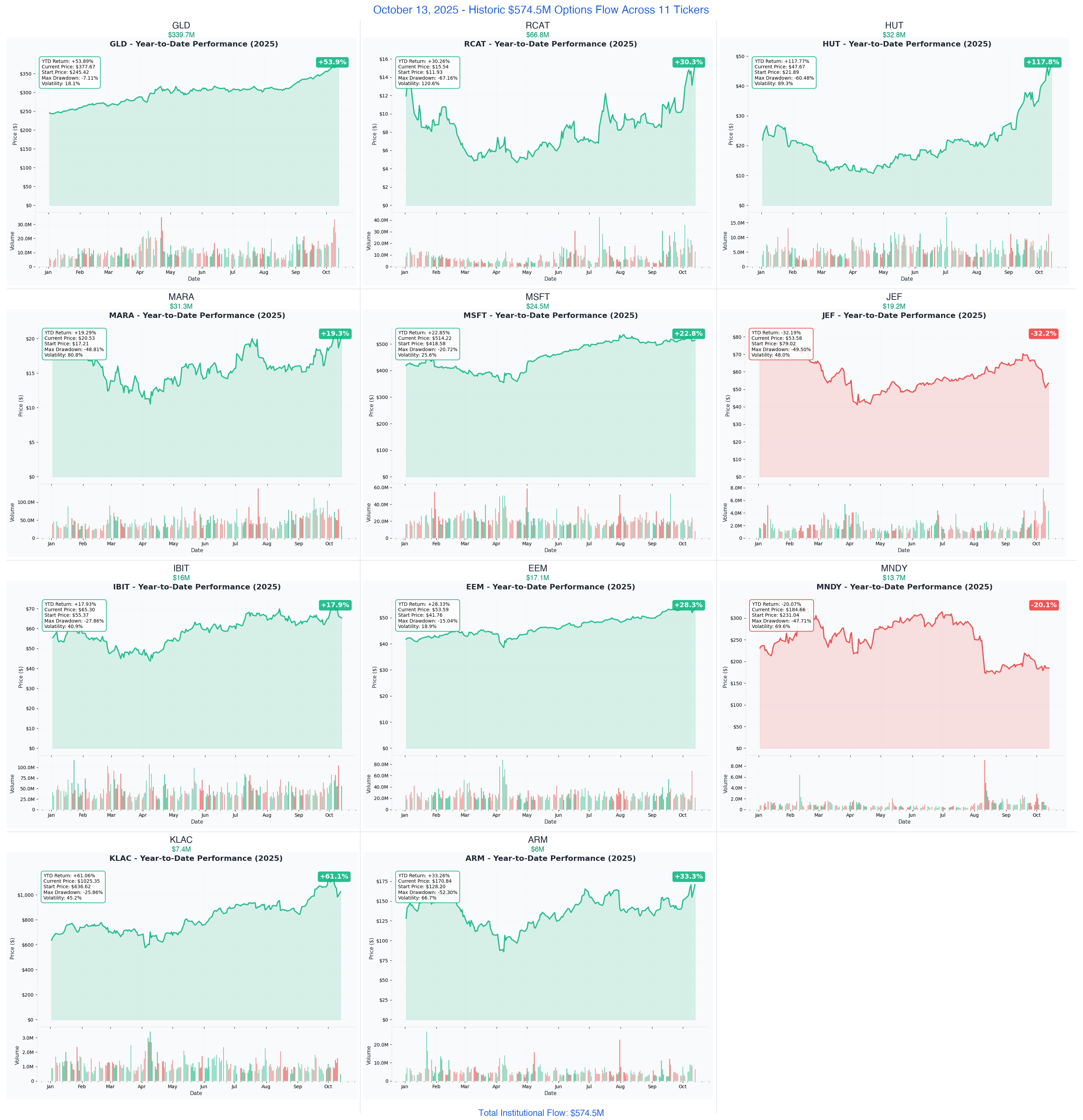 📅 October 13, 2025 | 🌋 HISTORIC DAY: $455.7M Institutional Premium + GLD's RECORD $339.7M Gold Bet + RCAT's $3.2M Defense LEAP + Crypto Miners Get $53.5M Combined | ⚠️ 11 Tickers Show Extreme Unusual Activity