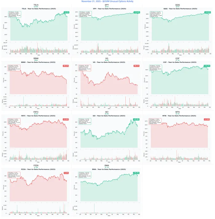 🔥 DEFENSIVE REPOSITIONING MEETS BOTTOM FISHING: We just tracked $250.2 MILLION in sophisticated options activity across 11 tickers - headlined by TSLA's massive $103M defensive roll (lowering strikes, extending time), SPY's $61M bullish put sale declaring market support, and QQQ's $37M premium collection before year-end. This isn't blind speculation - institutions are simultaneously protecting post-rally gains (TSLA), betting on market floors (SPY/QQQ), and hunting for beaten-down turnarounds (BBWI down 62%, PZZA down 37%, VG down 69%). The message: smart money is securing winners while accumulating losers at capitulation levels.