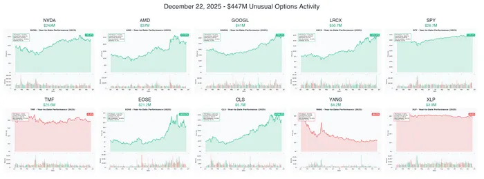 Today's unusual options activity captured nearly half a billion dollars in sophisticated institutional positioning. NVIDIA's massive $249M calendar spread anchors the flow, betting on Q1 2026 catalysts around GTC conference. Meanwhile, bearish setups on SPY ($28.7M), TMF ($25.6M), and GOOGL ($41M) signal profit-taking and hedging as the Santa Rally thesis gets stress-tested by the Fed's hawkish December stance.