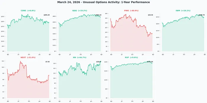🔥 We just tracked $93.4 MILLION in institutional options activity across 7 tickers — spanning EDA software, Nasdaq-100, small-caps, LNG energy, GPS technology, and equal-weight equity rotation. The standout: a $38.2M bull put spread on CDNS ahead of April 27 earnings, a $33.9M four-leg put structure on IWM as small-caps balance on the edge of correction territory, and a $9.3M multi-leg call complex on NN positioned for a binary FCC decision on April 30.