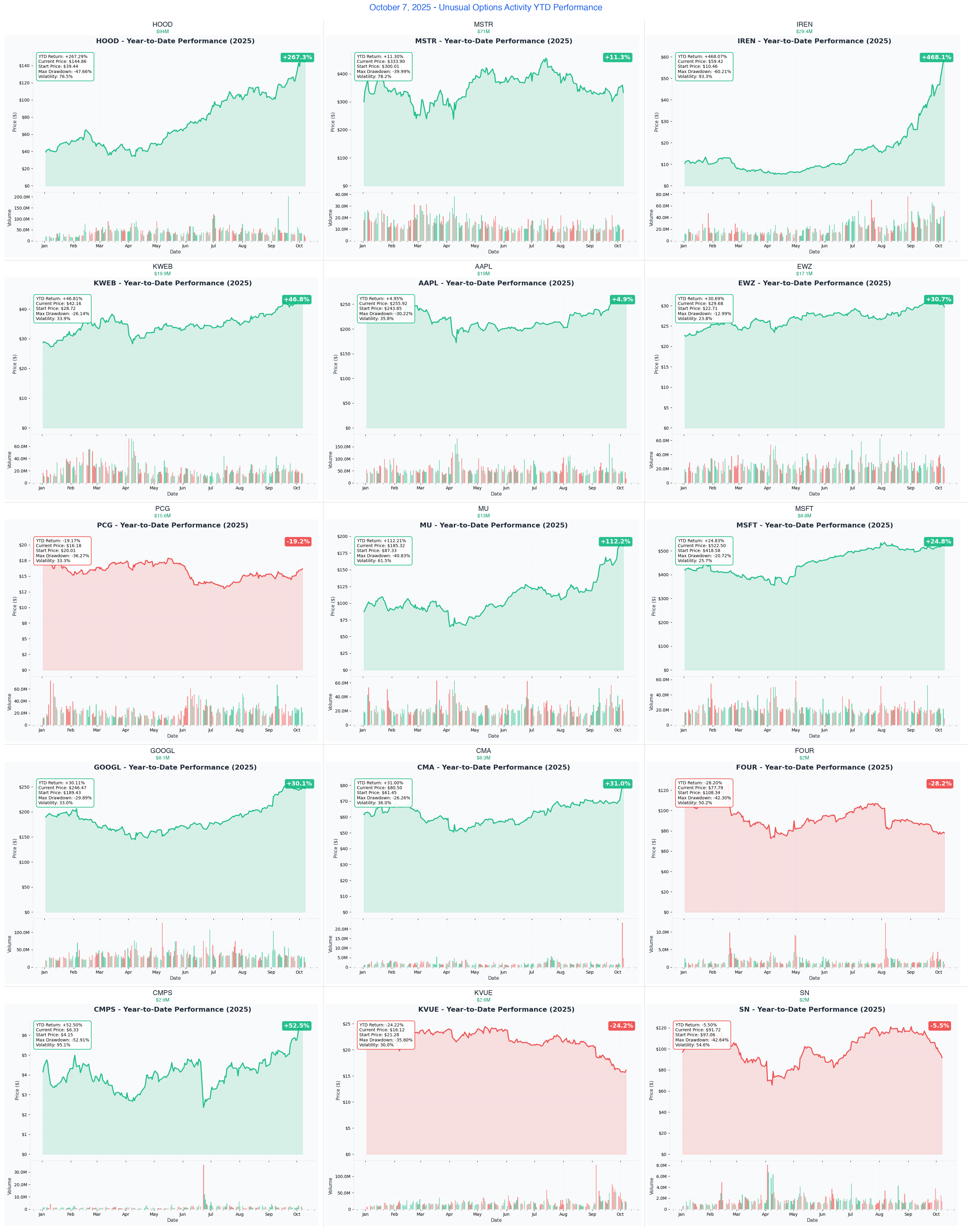 October 2025 brings unprecedented institutional activity across 15 tickers and $311.7M in premium. This newsletter surfaces the most significant patterns, but each ticker has unique catalysts, gamma levels, and risk factors. Read the complete analysis for each position before trading. Remember: Smart money exits winners (HOOD, IREN) as often as they accumulate value plays (MSTR, KWEB). Follow the strategy, not just the premium size.