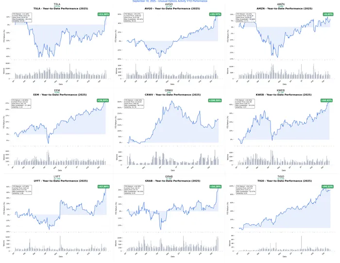 Today's $586M Message: Institutions are making their biggest Q4 bets of the year, with AI and autonomous vehicles dominating 89% of flow. The Tesla $297M position ahead of robotaxi launch and Broadcom's $217M multi-strike accumulation signal massive confidence in AI infrastructure expansion. Meanwhile, emerging market profit-taking and geographic rotation show smart money rebalancing risk. With critical catalysts in October (Tesla robotaxi, Q3 earnings) and year-end positioning already underway, this could be the setup for explosive Q4 moves.