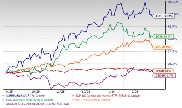 Albemarle Corporation’s ALB shares have popped 121.3% in the past six months, outperforming the Zacks Chemical - Diversified industry’s rise of 2.7% and the S&P 500’s increase of 4%. The rally has been fueled by the company’s forecast-topping earnings performance, supported by volume growth in the Energy Storage segment, ongoing cost-reduction initiatives and a rebound in lithium prices amid strengthening demand and tighter supply conditions.