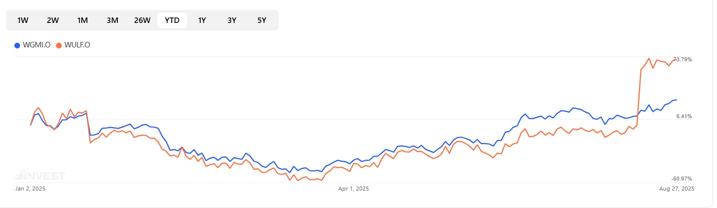 prices pulled back from fresh all-time highs. That divergence underscored a key point: WGMI’s performance isn’t always just about bitcoin—it can also reflect company-specific news among its holdings.On that trading day, the spotlight shone on TeraWulf (WULF), WGMI’s top-10 holding, which skyrocketed more than 59% on six times its average trading volume. The catalyst? A Google parent Alphabet (GOOGL) investment that could redefine how crypto miners fit into the artificial intelligence (AI) and high-performance computing (HPC) ecosystem.