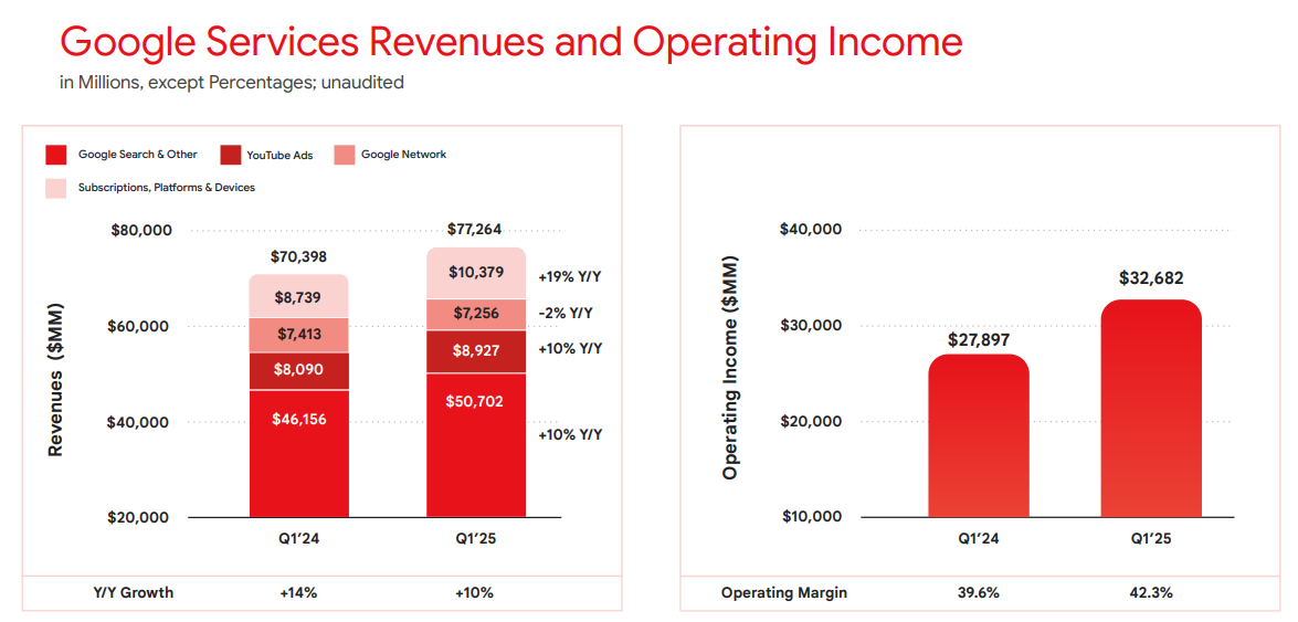 Total Google Services revenue increased nearly 10% to $77.26 billion, led by Search, YouTube, and a notable $10.38 billion in subscriptions, platforms, and devices revenue—a figure that beat estimates by nearly half a billion. The company now boasts over 270 million paid subscribers across services such as YouTube Premium and Google One, signaling that its consumer monetization efforts continue to pay off.