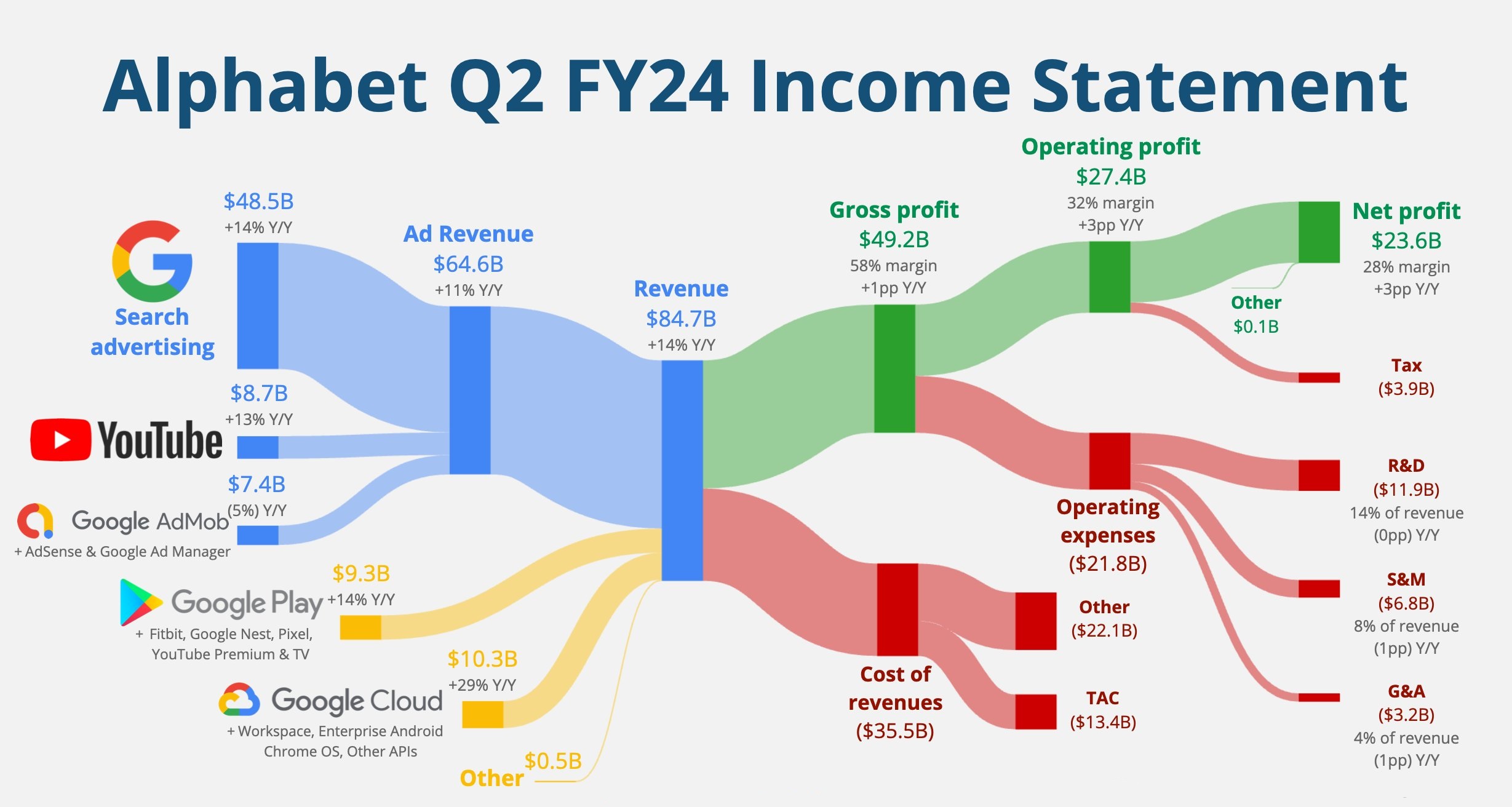 Alphabet reported strong second-quarter results, both revenue and net income beat analysts' expectations, driven by Google Cloud and search strength.