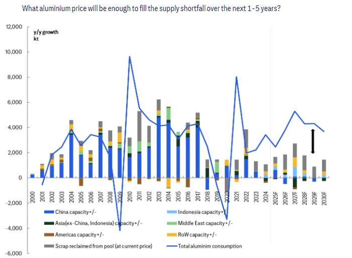 If supply growth and scrap recovery still fall short, prices will need to rise even further to suppress demand. In that case, aluminum may need to trade near $4,000 per ton—similar to the levels required to balance the market in the early 2000s.