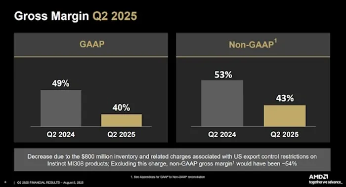 The headline numbers were a mixed bag. Revenue came in at $7.69 billion, beating consensus of $7.42 billion and marking a 32% year-over-year increase. But adjusted EPS of $0.48 narrowly missed the $0.49 consensus, with the shortfall driven largely by margin compression tied to a steep $800 million inventory charge related to U.S. government restrictions on AI GPU exports to China. That charge also weighed on reported operating income, which came in at a loss of $134 million on a GAAP basis. Stripping out those charges, AMD’s adjusted gross margin landed at 43%, slightly down from prior quarters, while GAAP gross margin slumped to 40%.
