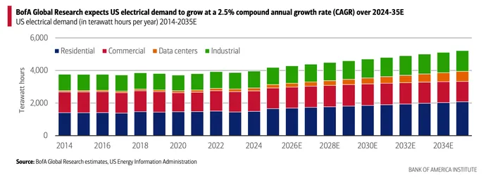 Bank of America Institute forecasts U.S. electrical demand to rise at a 2.5% compound annual growth rate (CAGR) from 2024 through 2035 — five times faster than the 0.5% growth recorded between 2014 and 2024. While AI and data centers have been at the forefront of public debate, analysts say the largest driver is actually residential building electrification, which could require the average U.S. household to consume 220% more electricity if converted to all-electric systems.