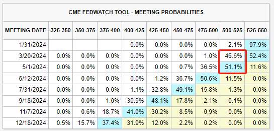 The market expects the Federal Reserve to make its first rate cut at the meeting on April 30th-May 1st, with a probability of 91%. Meanwhile, futures show that the probability of a rate cut at the meeting on March 19-20 is less than 50%. Three weeks ago, the probability of a rate cut in March was as high as 80%.