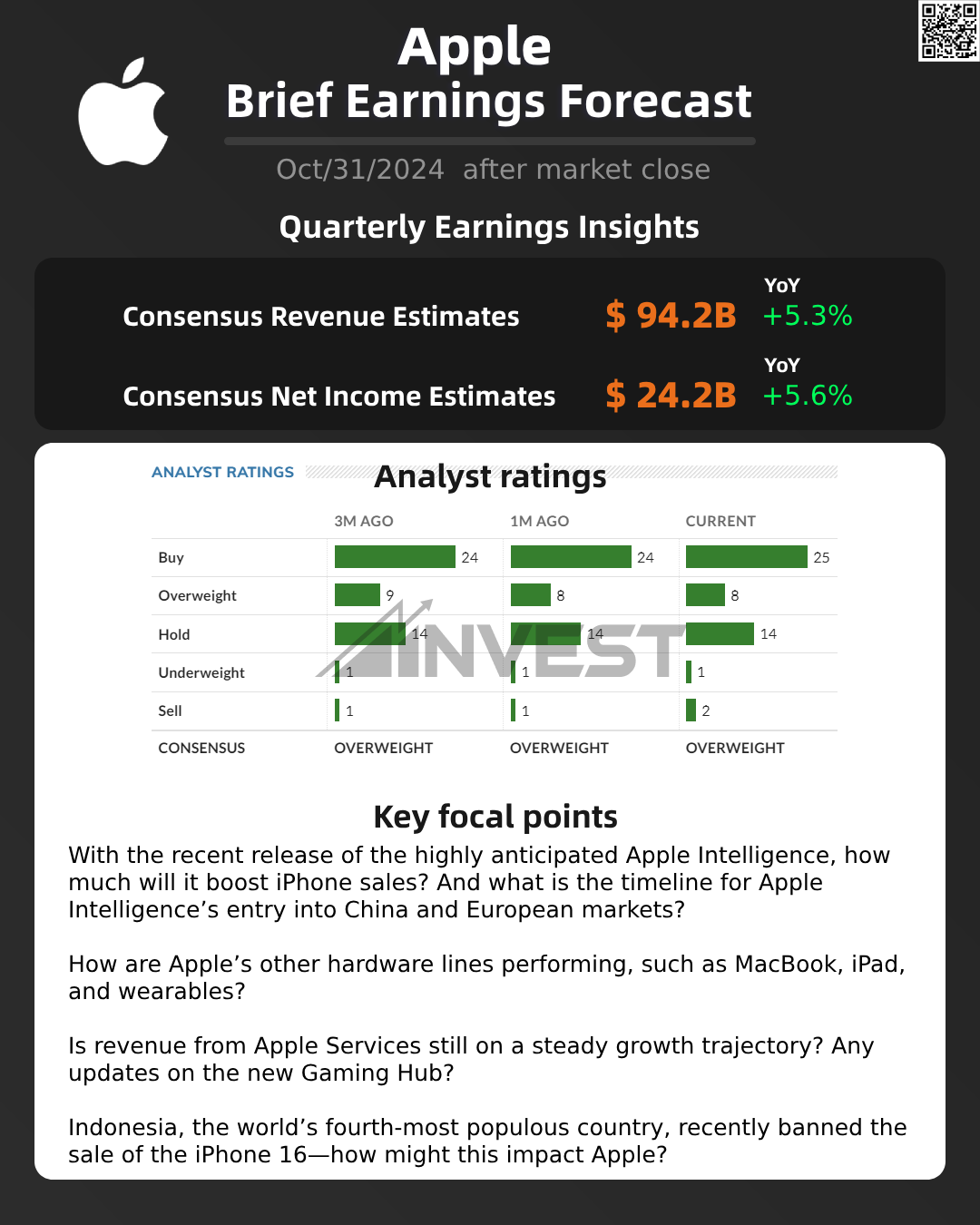 However, there are some headwinds for iPhone 16. Renowned analyst Ming-Chi Kuo has indicated that iPhone 16 orders may be cut by around 10 million units for Q4 2024–H1 2025. Morgan Stanley also notes that since its September release, the delivery cycle for the iPhone 16 has slowed in the eighth week, with the Pro models seeing a more noticeable slowdown. Tim Cook is expected to share insights into demand for the latest iPhone in the upcoming earnings report.