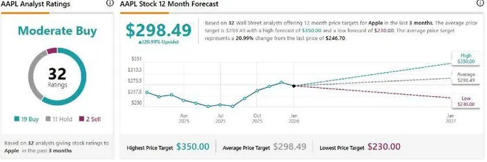 Despite the recent weakness, Wall Street remains constructive. According to TipRanks, 59% of analysts rate Apple a Buy, with an average price target of $298.49 and a bull-case target as high as $350.