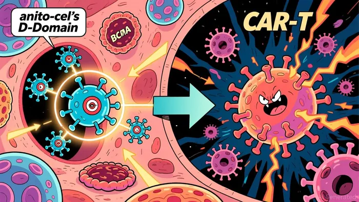 A key innovation addressing this gap is the D-Domain binder technology in anito-cel. This compact antibody platform enables precise BCMA targeting with potentially improved safety characteristics compared to conventional CAR-T constructs. Early clinical signals support this hypothesis, with the trial demonstrating no delayed neurotoxicities observed in this heavily pre-treated cohort.