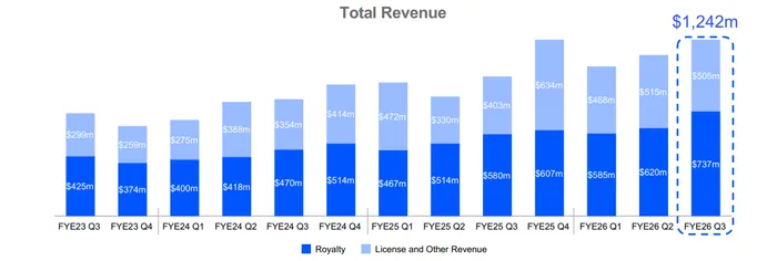 The main “tell” in the report was licensing. License and other revenue rose 25% year over year to $505M, but it came in below the ~$520M area that the Street was looking for. That shortfall is not catastrophic in isolation (licensing is inherently lumpy), but it matters because licensing is one of the cleanest signals of forward demand and pricing power for Arm’s next-gen IP. When the market is already jittery about tech spending and handset volumes, a licensing miss is interpreted less as “timing” and more as “is demand normalizing?”—especially at Arm’s premium valuation bar.