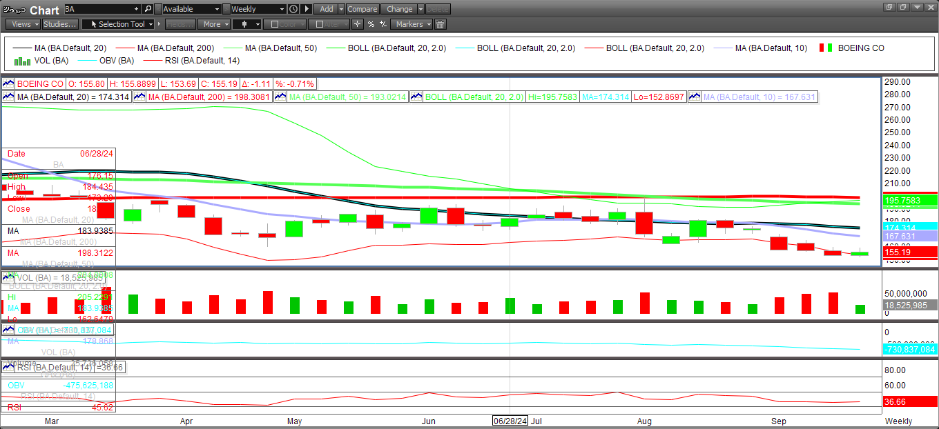 Shares of BA are hanging on to a thread at the $155 level. This represents the lower end of the Bollinger band. The RSI sits at 38 which suggests it has not hit oversold territory. If the strike lingers on and credit agencies downgrade the company's debt, then that could lead to a flush lower.