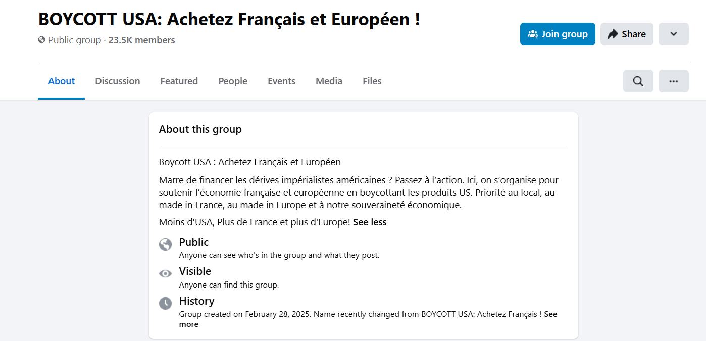 After Trump's tariff threats, the search volume for "Boycott USA" surged on Google, with key regions including Denmark, Canada, and France. Facebook groups advocating for a boycott of American goods also sprouted, where people passionately discuss how to avoid American products and find alternatives.