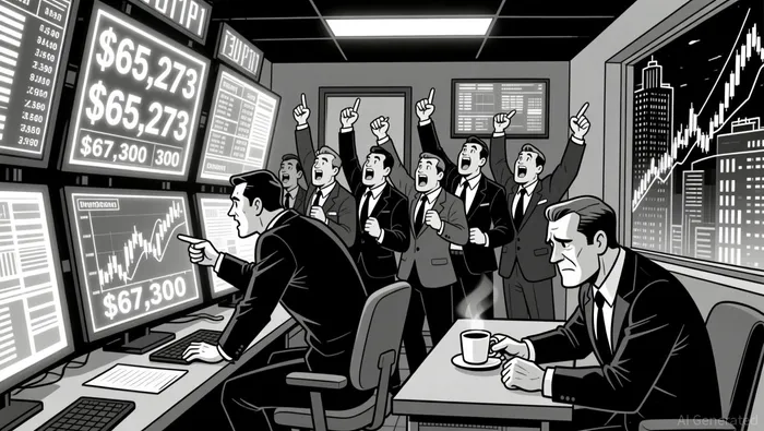 Price action displayed a bullish engulfing pattern between 18:00 and 18:15 ET as BTCUSDTBTC-- surged from $64,957.95 to $65,273.57. Another significant formation occurred near $66,800 in the early morning hours, where a large bullish candle suggested renewed buying pressure. A doji formed around $67,300, indicating indecision and potential resistance. Key support appears at $66,400, where price tested during the afternoon, and resistance is expected around $67,300.