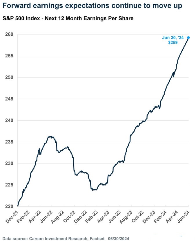 However, corporate EPS growth remains strong, suggesting that although companies may appear overvalued now, these multiples could align with reality as earnings continue to rise. Forward earnings expectations have consistently increased over the past few years, potentially explaining why investors are willing to pay high premiums for stocks at current prices.