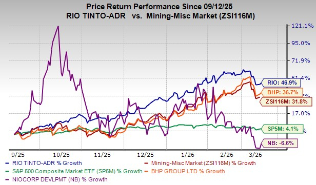 Rio Tinto Group RIO shares have surged 64.9% in the past six months, outperforming the industry and the S&P 500, which have returned 31.8% and 4.1%, respectively. Among its peers, BHP Group Limited’s BHP shares have gained 36.7% and NioCorp Developments Ltd. NB declined 6.6%, respectively, over the same time frame.