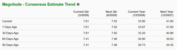 The Zacks Consensus Estimate for ASML’s 2026 earnings is pegged at $33.8, indicating a year-over-year improvement of 21%. The consensus estimate has been revised upward in the past seven days.
