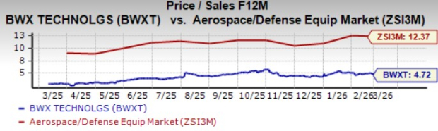 BWX Technologies is trading at a discount relative to the industry, with a forward 12-month price-to-sales of 4.72X compared with the industry average of 12.37X.